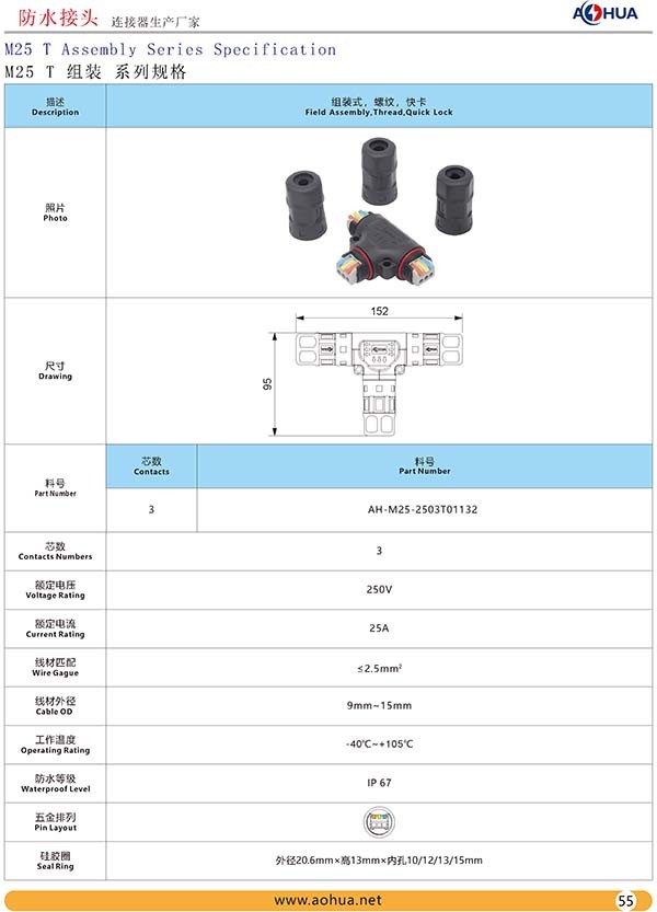 AHUA澳華M25軌道交通防水插頭三通防水連接器免焊接插頭
