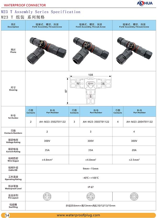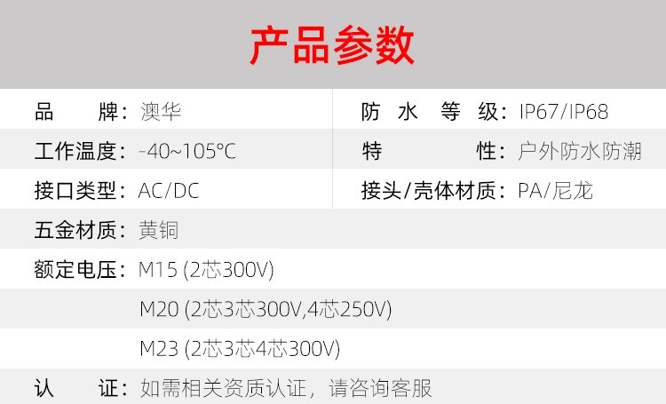 AHUA澳華公司專業(yè)生產(chǎn)LED防水插頭連接器、路燈模組分線盒、工控防水公母接頭、光伏航空插頭、新能源防水電源連接線、植物生長(zhǎng)燈連接線、畜牧養(yǎng)殖連接線、汽車(chē)線束。工廠自有模具制造、電線電纜押出、大型注塑、五金制造,雙生產(chǎn)基地,可來(lái)圖來(lái)樣個(gè)性化定制,國(guó)家高新技術(shù)規(guī)模企業(yè)!