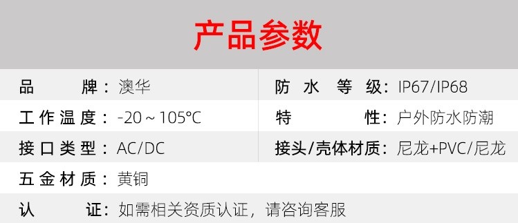 AHUA澳華公司專業(yè)生產(chǎn)LED防水插頭連接器、路燈模組分線盒、工控防水公母接頭、光伏航空插頭、新能源防水電源連接線、植物生長燈連接線、畜牧養(yǎng)殖連接線、汽車線束。工廠自有模具制造、電線電纜押出、大型注塑、五金制造,雙生產(chǎn)基地,可來圖來樣個(gè)性化定制,國家高新技術(shù)規(guī)模企業(yè)!