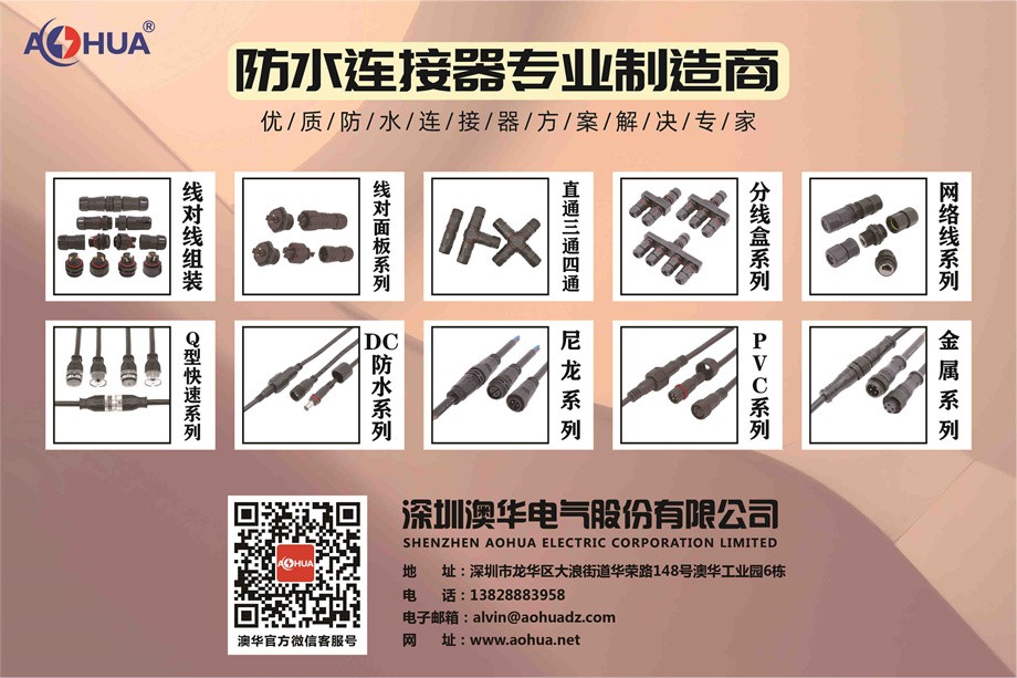 AHUA澳華公司專業(yè)生產(chǎn)LED防水插頭連接器、路燈模組分線盒、工控防水公母接頭、光伏航空插頭、新能源防水電源連接線、植物生長(zhǎng)燈連接線、畜牧養(yǎng)殖連接線、汽車線束。工廠自有模具制造、電線電纜押出、大型注塑、五金制造,雙生產(chǎn)基地,可來圖來樣個(gè)性化定制,國(guó)家高新技術(shù)規(guī)模企業(yè)!