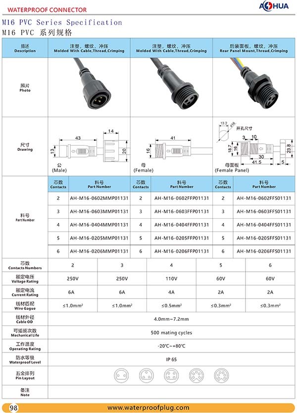 AHUA澳華公司專業(yè)生產(chǎn)LED防水插頭連接器、路燈模組分線盒、工控防水公母接頭、光伏航空插頭、新能源防水電源連接線、植物生長(zhǎng)燈連接線、畜牧養(yǎng)殖連接線、汽車(chē)線束。工廠自有模具制造、電線電纜押出、大型注塑、五金制造,雙生產(chǎn)基地,可來(lái)圖來(lái)樣個(gè)性化定制,國(guó)家高新技術(shù)規(guī)模企業(yè)!