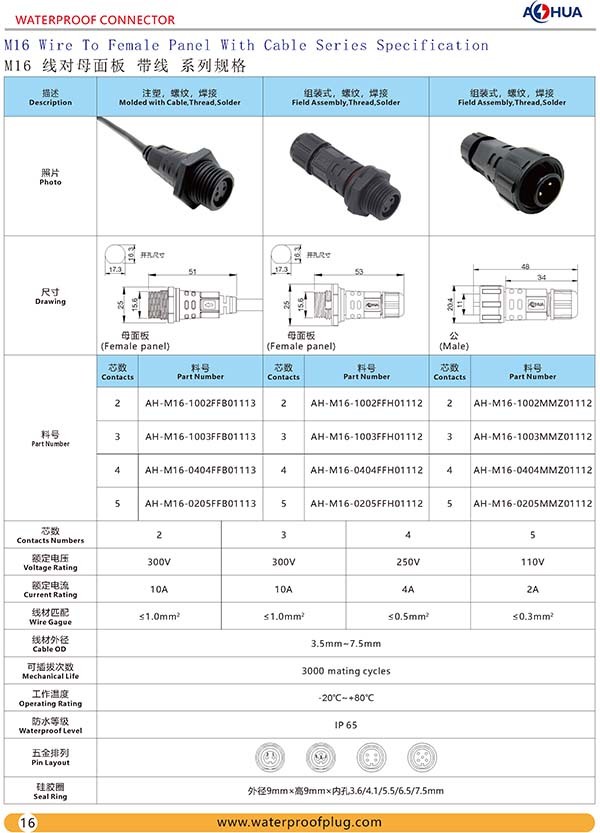 AHUA澳華M16前置母面板養(yǎng)殖場防水連接器新能源公母接頭
