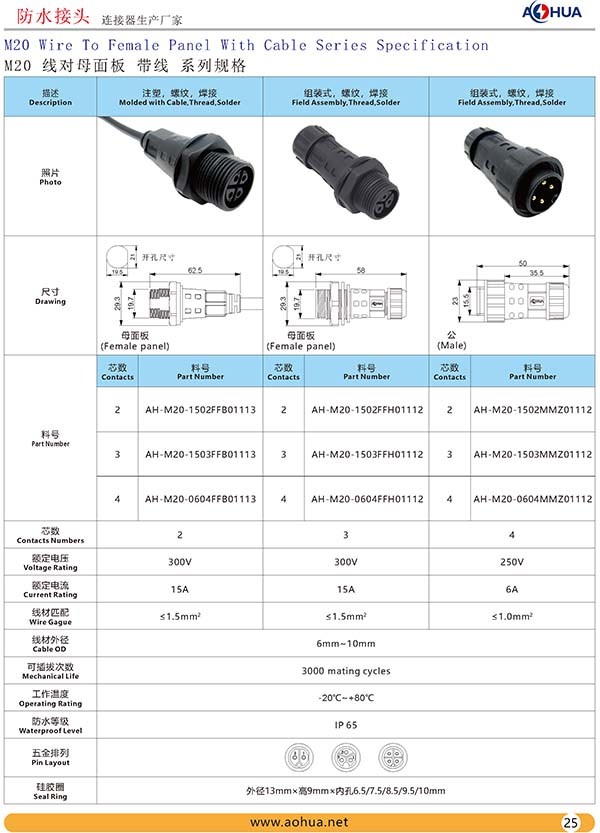 AHUA澳華防水連接器M20母面板LED燈具養(yǎng)殖水族箱防水插頭