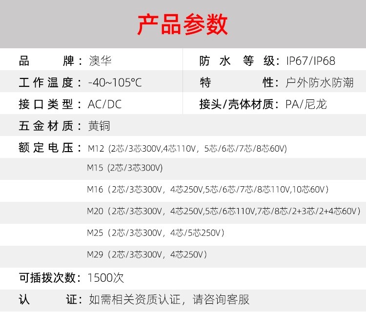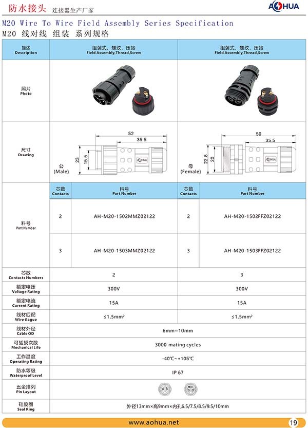AHUA澳華公司專業(yè)生產LED防水插頭連接器、路燈模組分線盒、工控防水公母接頭、光伏航空插頭、新能源防水電源連接線、植物生長燈連接線、畜牧養(yǎng)殖連接線、汽車線束。工廠自有模具制造、電線電纜押出、大型注塑、五金制造,雙生產基地,可來圖來樣個性化定制,國家高新技術規(guī)模企業(yè)!